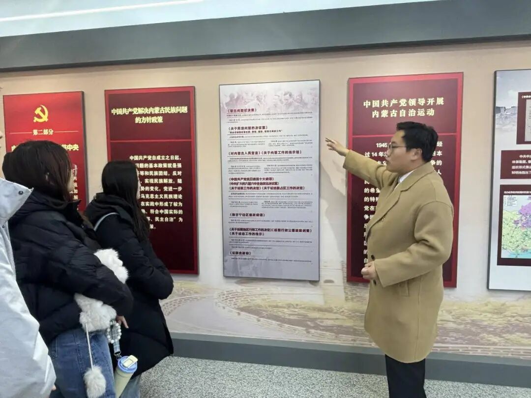 研学现场,讲解员从建党的阶级基础、思想根基和组织保障入手,讲述了中国共产党与内蒙古地区的深厚历史渊源。同学们重点学习了李大钊培育内蒙古首批党员的事迹,了解了1925年当地首个少数民族党组织诞生、1947年内蒙古自治政府成立等关键节点,深切体会到各族人民在中国共产党的领导下当家作主的艰辛与荣光。