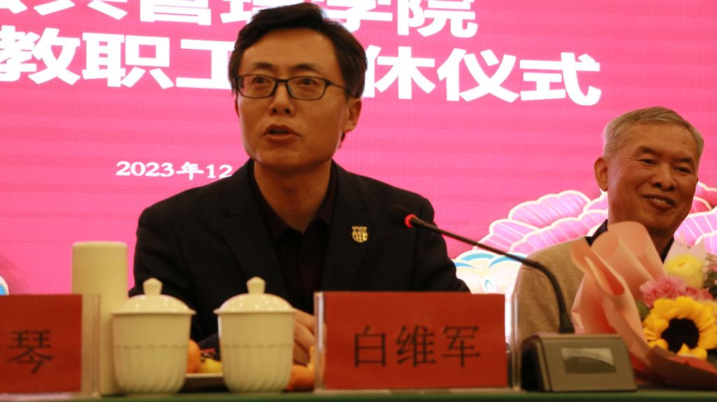 白维军院长代表学院讲话,对退休老教师几十年来为教育事业的辛勤付出和为学院所做的重要贡献给予了充分肯定,对退休老教师为人师表、行为世范的崇高品质给予了高度评价。白院长指出公管院的今天离不开各位荣休教师几十年如一日的无私奉献和默默付出,他们是学院事业发展的亲历者、建设者和贡献者,是他们几十年如一日的辛勤付出,才铸就了学院今天的成就。祝愿荣休教师未来生活更加美好、更加幸福,长安宁、多喜乐,健健康康、永不老!