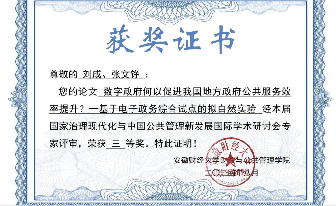本届会议设置优秀论文颁奖典礼和闭幕总结,优秀论文由组委会专家组从200余份稿件中严格评审选出,最终设优秀论文一等奖3名,二等奖6名,三等奖10名,我院刘成老师、本科生张文铮同学的论文《数字政府何以促进我国地方政府公共服务效率提升?——基于电子政务综合试点的拟自然实验》获论坛三等奖。