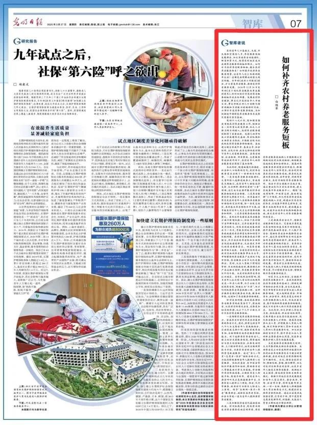 2024年12月30日发布的《中共中央 国务院关于深化养老服务改革发展的意见》指出,要“补齐农村养老服务短板,为加快推进中国特色养老服务体系成熟定型奠定坚实基础。”我国养老服务的短板在农村,难点也在农村。如何补齐农村养老服务短板,健全农村养老服务体系?如何提升农村养老服务质量,让老年人过上体面的晚年生活?白维军教授在深入调查研究的基础上形成此文,并发表于《光明日报》2025年3月27日第7版。