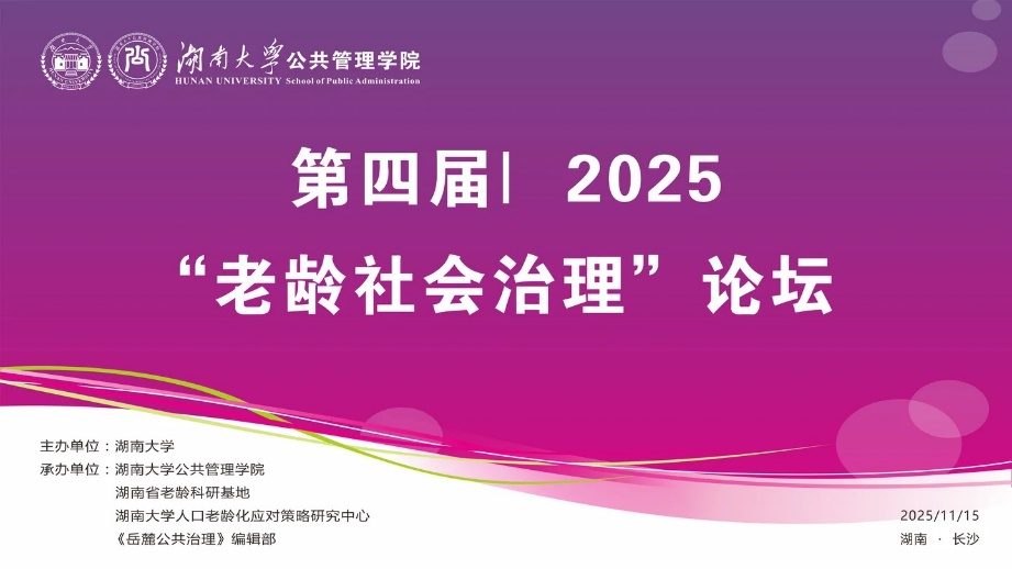 2025年11月15日,第四届“老龄社会治理”论坛在长沙举行。本次论坛由湖南大学主办,湖南大学yl6776永利集团、湖南省老龄科研基地、湖南大学人口老龄化应对策略研究中心及《岳麓公共治理》编辑部联合承办。论坛围绕老龄社会治理的前沿议题展开深度研讨与交流,并设“老龄社会治理与社会保障体系”“养老金融与银发经济”“养老服务与社会支持体系”“老龄健康与老年友好环境建设”及“老龄社会其他议题”五个分论坛。我院白维军院长应邀作主题报告演讲,博士研究生王邹恒瑞投稿参会并在第三分论坛作学术汇报。