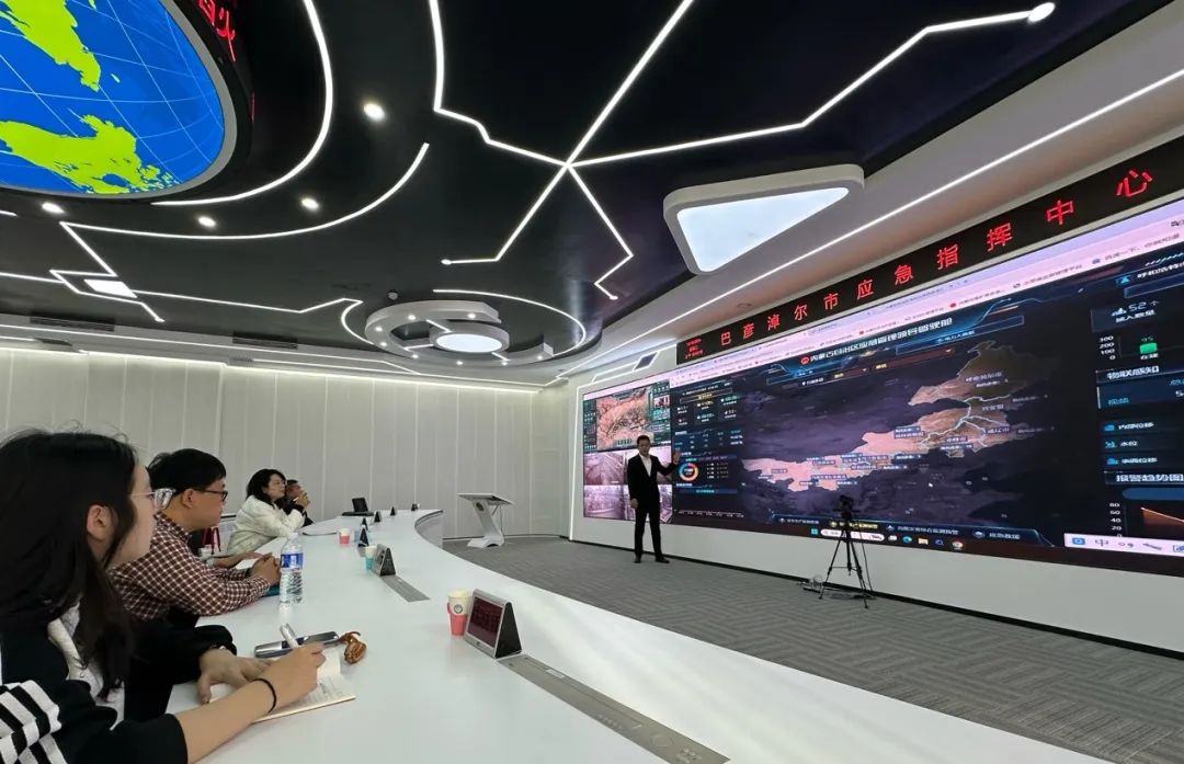 在巴彦淖尔市应急管理局,师生一行参观了巴彦淖尔市应急管理指挥中心,了解了智慧应急指挥平台的运作情况,并在随后进行的座谈会上深入交流了应急管理数字化资源的建设情况、运行情况。