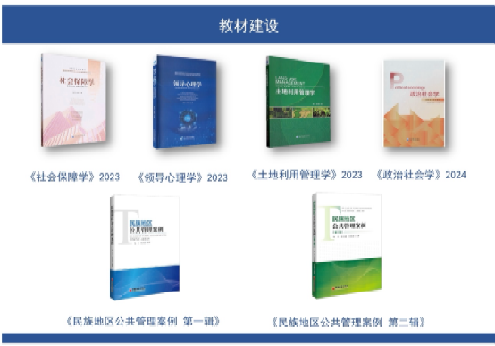 教材建设是事关教育事业与国家未来的基础工程、战略工程,高水平课程建设离不开高水平教材支撑,学院提出以“多层次、立体化、全覆盖”的教材建设支撑具有“科学性、完备性、竞争性”的优势课程体系,有组织地开展高水平教材建设。近五年,出版系列教材丛书4本,出版民族地区公共管理案例教材丛书2本。