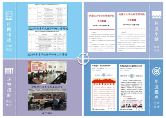 为实现学院高质量发展目标,学院实行全过程管理的工作模式,抓重点,重落实,有序推进学院各项工作。每学期伊始采用“挂图作战”进行前瞻谋划;每周召开班子例会,保证学院工作高效执行;每月进行工作小结,回顾纠偏;年终进行年度盘点,总结提升。