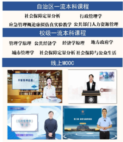 学院紧扣新文科建设要求,梳理专业课程教学大纲,重点打造“金课”。近五年,4门课程获批自治区级一流本科课程;8门课程获批校级一流本科课程;4门课程获批校级线上线下混合式一流本科课程建设项目;3门课程入选校级首批通识教育选修课2.0建设项目;线上课程建设取得成效,4门课程已完成MOOC录制并已上线;《政治学》在线课程获批全国公共管理硕士专业学位研究生在线示范课程“在线优质课”;《“愚公移沙”—库布其沙漠从死亡之海变生命绿洲》入选全国公共管理“优质案例课堂”。1门荣获校级首批人工智能赋能教学试点课程建设项目。
