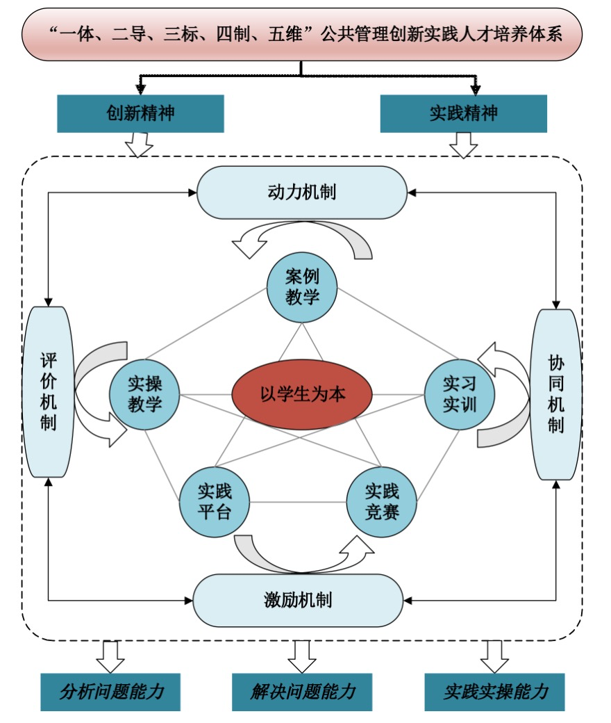 学院构建了“一体、二导、三标、四制、五维”的公共管理创新实践本科人才培养模式,即“以学生为本”为主体,以培育“公共精神和创新实践精神”为导向,以提高学生“分析问题能力、解决问题能力、创新实践能力”为目标,以健全“动力机制、协同机制、评价机制、激励机制”为保障,以“案例教学、实操教学、实践平台、实践竞赛、实习实训”为手段,多维结合的公共管理创新实践人才培养体系。“案例教学、实操教学、实践平台、实践竞赛、实习实训”的“五维融合”培养模式是实现公共管理创新实践人才培养的重要手段,具体包括:重视理论讲授与实践相结合的案例教学,引导学生在学习过程中建立课程的实践认知框架;加强公共管理模拟实操教学,拓展公共管理实践教学特色模式;建立公共管理案例教学与研发中心等科研实践平台,优化创新实践人才培养基地;举办并组织、指导学生参加各类创新实践竞赛,全面提高学生综合能力;加强实习实训环节,建立校内外指导老师相结合的联合指导模式,提高学生实际操作技能。