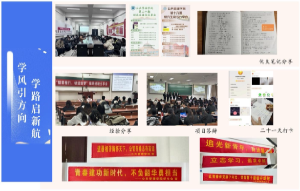 学院重视营造良好学习氛围,建设优良学习环境,依托“一站式”学生社区,积极开展各项学风建设活动,如21天自习打卡、优良学习笔记风采展、读书分享会、本科生学术创新训练营活动、考研—考公—求职经验交流分享会等。通过学风建设系列活动,引导师生共同营造浓厚的学习氛围,塑造学生良好的学习行为习惯。
