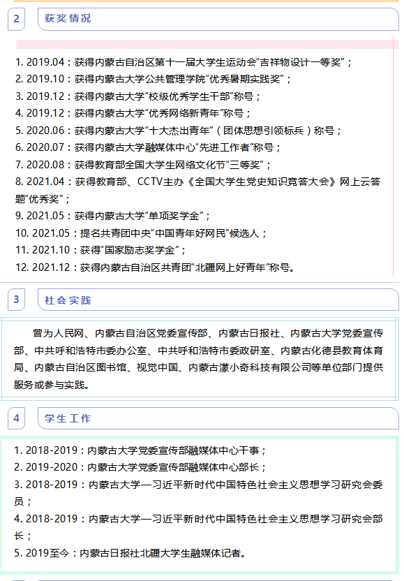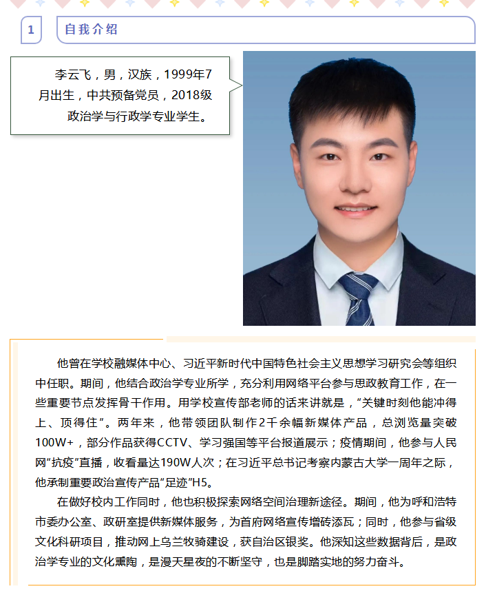 李佳琳,女,永利官网2023届政治学与行政学专业本科生,曾担任班级团支书、本科生党支部副书记、新生班辅导员等学生工作,曾获得乌兰夫奖学金、内蒙古自治区级“三好学生”、求实奖学金、优秀学生干部、优秀团干部等多项荣誉称号。2023年推免至南开大学马克思主义学院攻读硕士研究生学位,担任南开大学校研究生会干事等学生干部、学院研究生会干事、硕士新生班党支书。