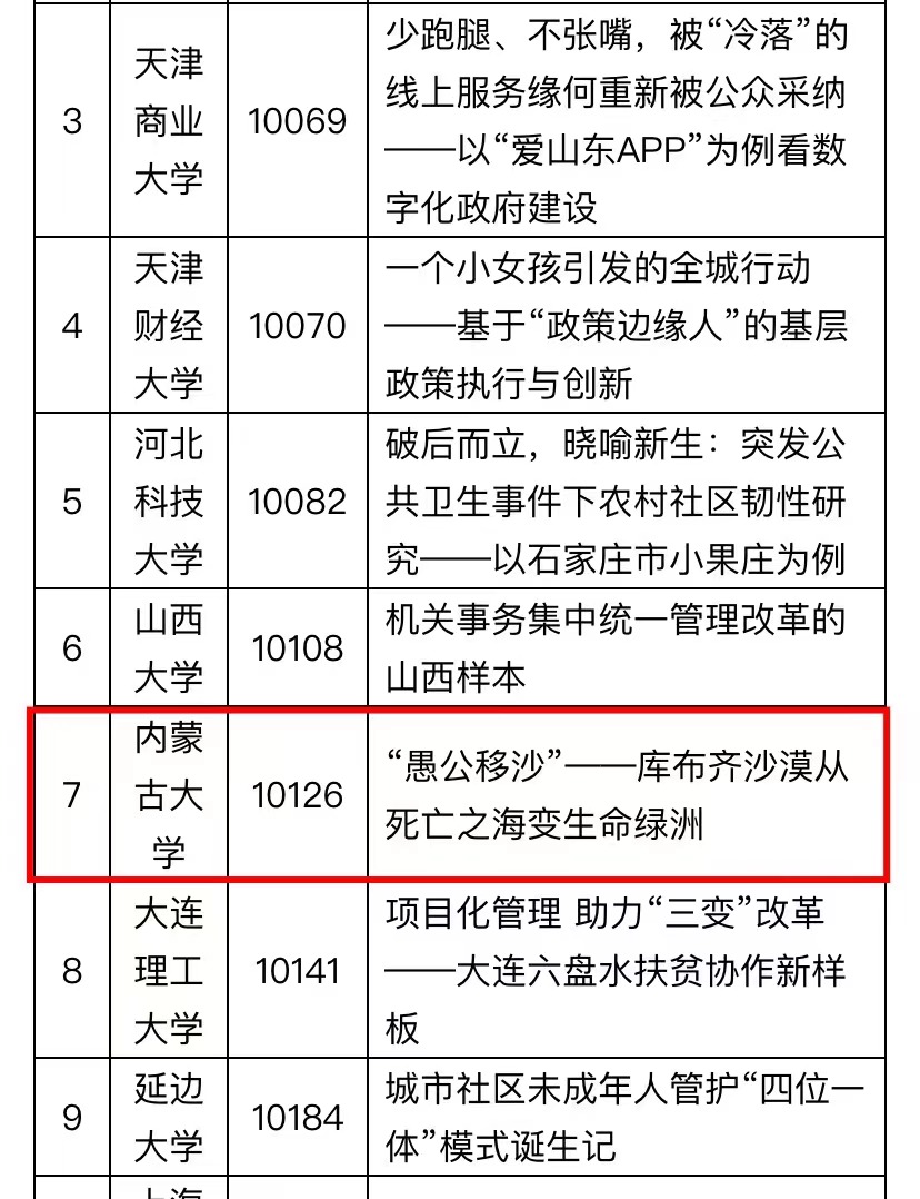近日,全国公共管理专业学位研究生(MPA)教育指导委员会发布了2023年全国公共管理“精品案例课堂”和“优质案例课堂”名单。经过严格的文本检查、专家评审、教指委会审议及投票等环节,共选出“精品案例课堂”15项,“优质案例课堂”37项。我院李沃源副教授申报的《“愚公移沙”—库布齐沙漠从死亡之海变生命绿洲》入选“优质案例课堂”名单。