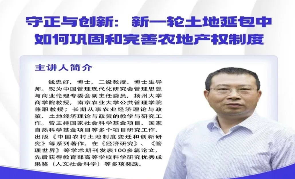 9月4日下午,MPA教育中心在赛罕校区研究生楼408教室举办了“守正与创新:新一轮土地延包中如何巩固和完善农地产权制度”主题讲座。讲座由扬州大学商学院教授、博士生导师钱忠好主讲,MPA教育中心副主任刘桂英主持,2024级MPA研究生140余人参加。钱忠好教授阐释了新一轮土地延包中守正与创新的重要意义,认为正确处理二者关系事关我国能否如期建成农业强国、能否实现农村社会的和谐稳定,并从守正与创新的视角出发,通过现实案例...