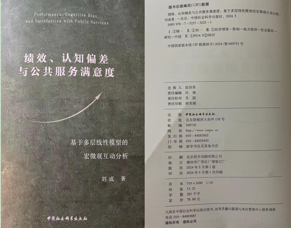 日前,中国社会科学出版社2024年出版我院刘成博士的学术著作《绩效、认知偏差与公共服务满意度——基于多层线性模型的宏微观互动分析》,全书20余万字。 本书是一部有关公共服务满意度的学术著作。公众支持是政府合法性的重要来源,而公共服务是现代政府赢得公众认可的关键。理解公众对公共服务的反应始终是公共管理学界和实践界关注的核心议题。在建设人民满意的服务型政府的关键性阶段,公众满意已成为衡量公共服务水平的...